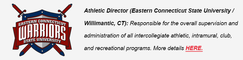 (NEW!) Athletic Director (Eastern Connecticut State University / Willimantic, CT): Responsible for the overall supervision and administration of all intercollegiate athletic, intramural, club, and recreational programs. More details HERE.